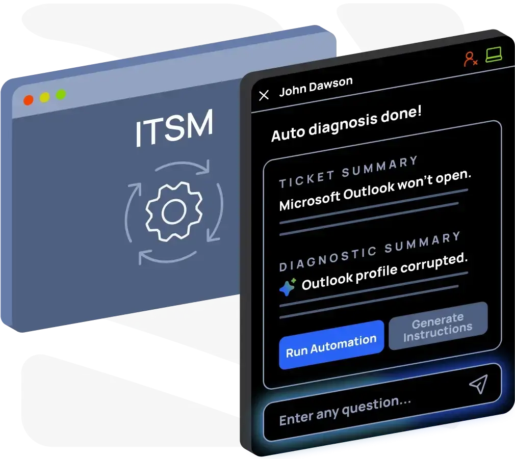 SysTrack AI’s autonomous diagnostics engine uses SysTrack’s rich and contextual data alongside knowledge base articles, LLM reasoning, and other data sources to auto-diagnose root cause and create an impact map of affect users, devices, and services for mass-resolution.
